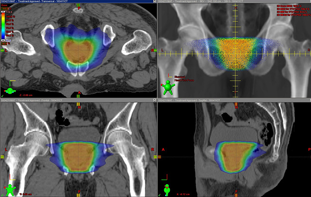 体外照射は複数のリニアックを使った最適なエネルギーのX線や電子線を使用し、副作用の少ない治療を行っています。コンピュータ制御で、がん病巣だけに集中照射しながら、周囲の正常組織にほとんど照射されない定位放射線治療(SRT2022年治療人数:脳44人、肺37人、その他20人)や強度変調放射線治療(IMRT2022年治療人数:頭頸部43人、前立腺76人、中枢神経21人、その他89人)を症例に応じて実施しています。IMRTの進化形で、より短時間の治療が可能な強度変調回転照射(VMAT)、さらに呼吸同期放射線治療や画像誘導放射線治療(IGRT)の組み合わせにより高精度の治療が可能であり、適応症例も順次拡大しています。また、症例に応じてRALSによる高線量率(HDR)やCs-137などによる低線量率(LDR)の小線源治療も行っています。形態や機能を温存し、生活の質(QOL)を維持できる放射線治療は、根治的治療はもちろん進行がんや再発・転移がんに対しても有効です。