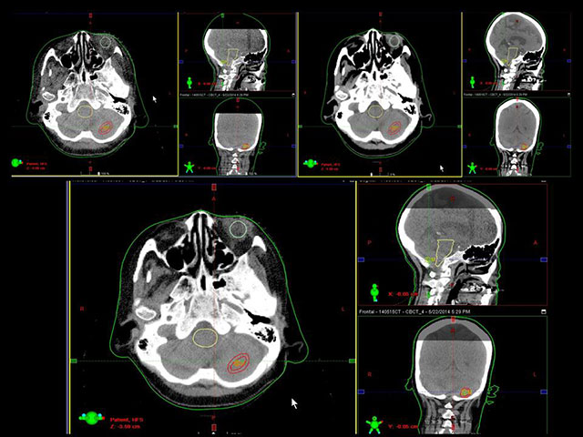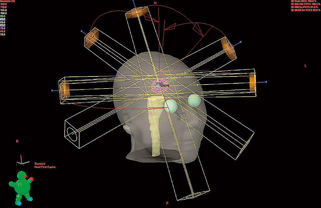 病巣へ放射線を集中させ、病巣の周りにある正常な組織への放射線の影響を最低限に抑え、治療を行います。