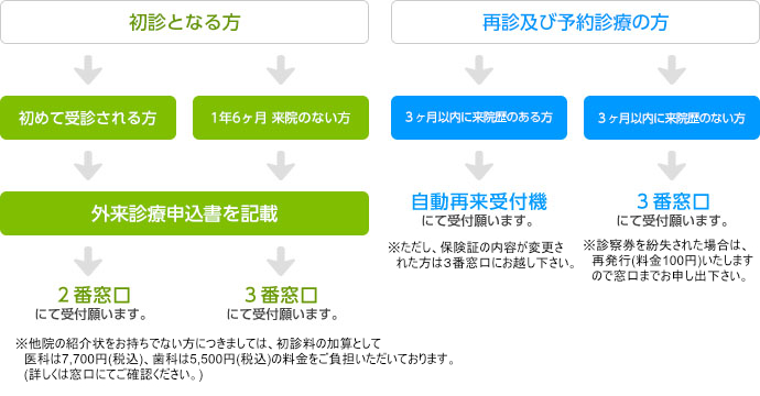 - 当院の紹介状をお持ちでない方は、初診時の加算として医科は7,700円(税込)、歯科は5,500円(税込)をご負担いただきます。詳細は窓口でご確認ください。